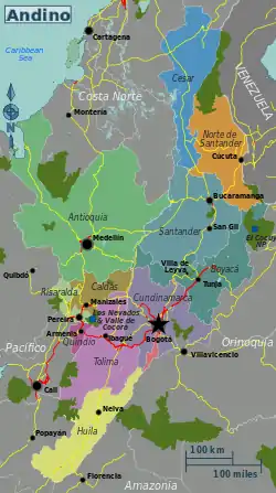 La región Andina[1][2] es una de las seis regiones naturales de Colombia. Está ubicada en el centro del país, limitando al norte con la región Caribe, al noreste con Venezuela, al este con la Orinoquía, al sureste con la Amazonia, al sur con Ecuador y al oeste con la región del Pacífico.