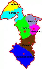La capital es la ciudad de Trnava. Otras ciudades importantes son Senica, Galanta, Piešťany, Dunajská Streda y Skalica.