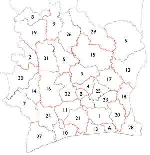 Desde el año 2011 hay 31 regiones en Costa de Marfil (entre paréntesis se muestra el año de su creación):