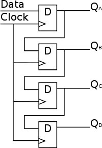 - Biestables en cascada. Con esto y la lógica combinacional adecuada, se pueden construir incluso registros de desplazamiento bidireccionales y universales, aunque en este caso es más aconsejable disponer del 74HC194, dado que ocupa mucho menos espacio (y el precio del integrado es muy asequible) y en un solo integrado incluye las cuatro posibles configuraciones y la funcionalidad de desplazar los bits en ambos sentidos.