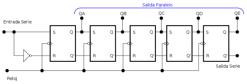 Un registro de desplazamiento es un circuito digital secuencial (es decir, que los valores de sus salidas dependen de sus entradas y de los valores anteriores) consistente en una serie de biestables, generalmente de tipo D, conectados en cascada (Fig. 1), que basculan de forma sincrónica con la misma señal de reloj. Según las conexiones entre los biestables, se tiene un desplazamiento a la izquierda o a la derecha de la información almacenada. Es de señalar que un desplazamiento a la izquierda de un conjunto de bits, multiplica por 2, mientras que uno a la derecha, divide entre 2. Existen registros de desplazamiento bidireccionales, que pueden funcionar en ambos sentidos. Los registros universales, además de bidireccionales permiten la carga en paralelo.