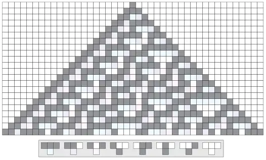 El siguiente diagrama muestra el patrón creado, con celdas coloreadas según el estado anterior de su vecindario. Los colores más oscuros representan "1" y los colores más claros representan "0". El tiempo aumenta por el eje vertical: