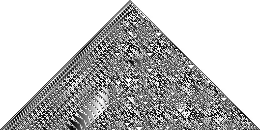 Aquí, el eje vertical representa el tiempo y cualquier sección transversal horizontal de la imagen representa el estado de todas las celdas de la matriz en un punto específico de la evolución del patrón. Varios motivos están presentes en esta estructura, como la frecuente aparición de triángulos blancos y un patrón de rayas bien definido en el lado izquierdo; sin embargo, la estructura en su conjunto no tiene un patrón discernible. El número de células negras en la generación viene dada por la secuencia