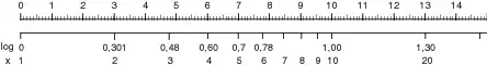 Situemos bajo ella otra línea, que marcaremos según los valores de los logaritmos decimales de los números de la primera escala. Esta segunda escala tiene su origen, su punto 0, coincidente con el de la primera, situándose sus restantes marcas a la altura que les corresponde en la primera según los valores de los logaritmos sucesivos, algunos de los cuales aparecen escritos en la siguiente línea, rotulada «log», a la izquierda de la figura inferior. Y para mayor claridad todavía puede colocarse debajo el guarismo correspondiente, línea que se etiqueta como «x» en esta figura. Se trata, en suma, de la representación gráfica de la ecuación y = log x. La primera línea de cifras representa los valores de y y la segunda los de x.