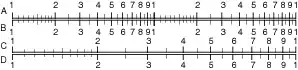 escala C "invertida", numerada de derecha a izquierda; escala de recíprocos | ||