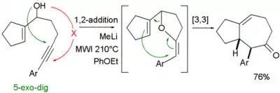 En un estudio, se construyeron anillos de siete miembros en una reacción de adición tándem 5-exo-dig, del tipo rearreglo de Claisen:[3]