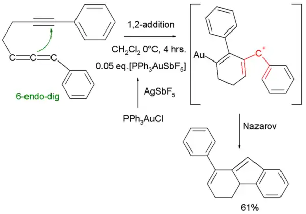 Se observó un patrón 6-endo-dig en una adición 1,2 tándem aleno - alquino del tipo ciclización de Nazarov, catalizada por un compuesto de oro:[4]