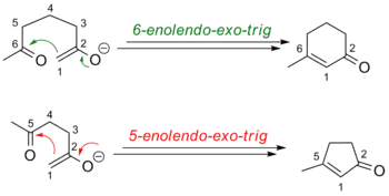Las reglas de Baldwin también se aplican a las ciclizaciones aldólicas que involucran a enolatos:[6][7]