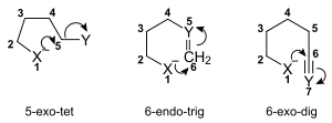 En consecuencia, una reacción de cierre de anillo podría ser clasificada como, por ejemplo, una 5-exo-trig.