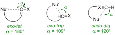 Las reglas se aplican cuando el nucleófilo puede atacar al enlace en cuestión en un ángulo ideal. Estos ángulos son 180° para las reacciones exo-tet, 109° para las reacciones exo-trig, y 120° para las reacciones endo-dig.