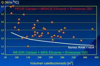 Esta norma conocida por establecer el coeficiente volumétrico global de pérdidas térmicas en calefacción Gcal en W/m³°C, establece un valor admisible de calidad térmica edilicia en relación a los grados día de calefacción del sitio donde se implantará el edificio.