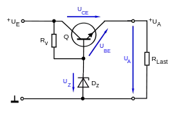 En este circuito la corriente de entrada sigue los cambios de la corriente por la carga, pero en el regulador paralelo la corriente por la carga se mantenía constante. Al haber sustituido la resistencia serie por un transistor, este regulador tiene un mayor rendimiento que el anteriormente visto, por lo que se utiliza en circuitos de mayor potencia. Si se produce una baja en el valor de la resistencia de carga, la corriente de entrada al circuito estabilizador aumenta, también aumenta la corriente por la resistencia Rv: como el diodo zener mantiene su tensión constante, aumenta la caída de tensión en Rv, con lo que la tensión colector-base del transistor aumenta, volviéndose menos conductivo y estabilizando el aumento inicial de corriente.