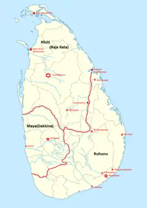 El reino a menudo se dividía en secciones o provincias y se gobernaba por separado. Rajarata, el área alrededor de la capital, estaba bajo la administración directa del rey, mientras que el Ruhuna (parte sur del país) y el Malaya Rata (país de la colina) estaban gobernados por funcionarios llamados apa y mapa. Estas unidades administrativas se dividieron en unidades más pequeñas llamadas rata . Funcionarios llamados ratiya o ratika estaban a cargo de estos.[Notas 3] La unidad administrativa más pequeña era la gama (aldea), bajo un jefe de aldea conocido como gamika o gamladda.[53]