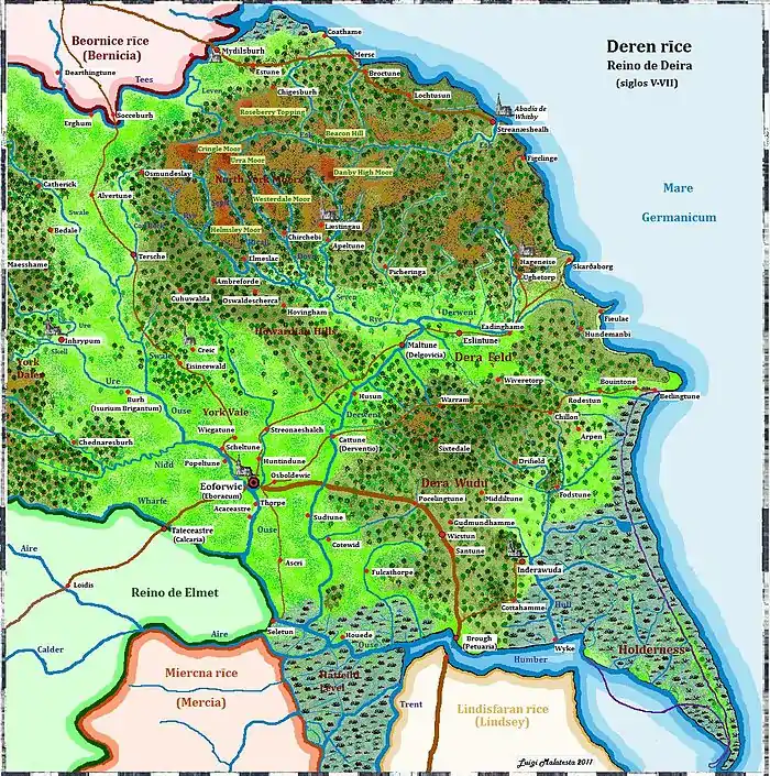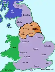 A principios del siglo V las legiones romanas abandonan la isla de Gran Bretaña por lo que las autoridades locales (provinciales y municipales) debieron asumir el liderazgo político y administrativo, es una época especialmente oscura de la historia británica y las pocas fuentes que nos han llegado (Annales Cambriae,[7][8] Gildas,[9] Harleian Genealogies[10]) son de difícil interpretación, ya que su contenido está entre lo legendario y lo histórico. Según estas fuentes las provincias del norte fueron gobernadas desde Ebrauc (York) por el legendario rey Coel Hen ("el viejo") que además sería el predecesor de todas las dinastías britanas de los reinos formados en el norte (Yr Hen Ogledd "el viejo norte").[11] York (Ebrauc) fue el reino gobernado por la línea principal de los Coelings ("sucesores de Coel") y por ello también el que sufrió más una sucesiva fragmentación. Los reinos britanos debían enfrentarse no solo a las confrontaciones entre ellos por el dominio territorial, sino además a la constante amenaza de incursiones por parte de pictos, frisones, sajones y pueblos escandinavos, y en este sentido fueron admitidos los anglos de Deywr, para asentarse como foederati y defender las costas de los ataques extranjeros. Posiblemente en el reinado de Ceneu ap Coel o de su hijo Mar ap Ceneu, los anglos deiranos se asentaron en el este del país al mando de su caudillo Sebaldo, hacia el segundo cuarto del siglo V, hechos corroborados por los yacimientos funerarios de esta época hallados en Yorkshire.