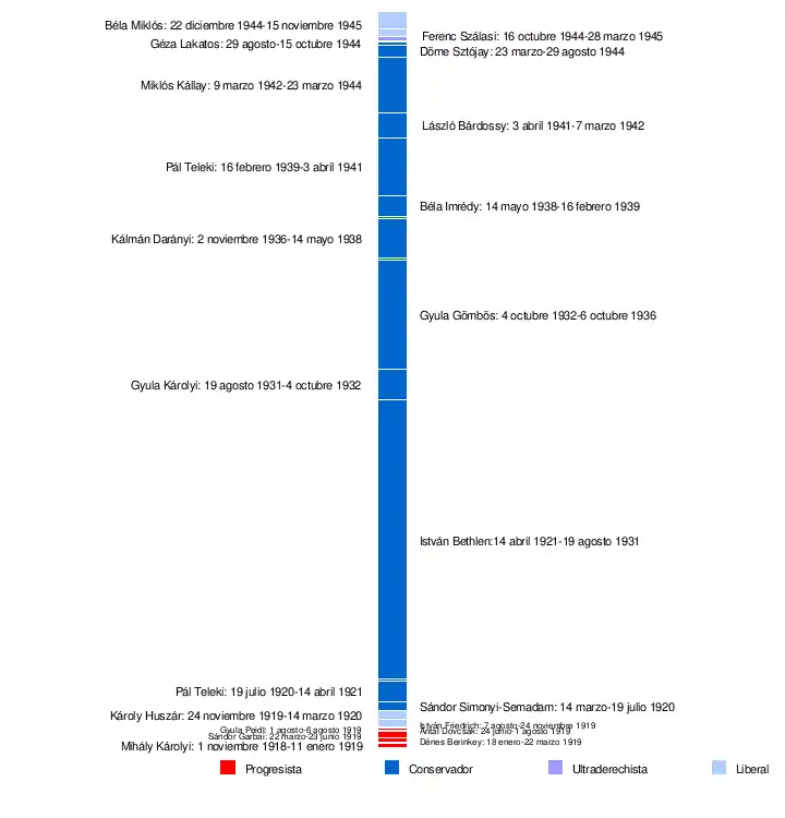 Tras la derrota militar de la República Soviética Húngara a finales del verano de 1919, dado que los conservadores eran partidarios de restaurar en el trono húngaro al antiguo emperador mientras que el Ejército y los radicales de derecha rechazaban la vuelta de los Habsburgo, se decidió la implantación temporal de una regencia en marzo de 1920.[2] El régimen del regente Horthy se caracterizó por su carácter conservador,[3] chovinistamente nacionalista y furibundamente anticomunista.[4] La regencia se sostuvo sobre una alianza inestable de conservadores y ultraderechistas.[5] La política exterior se caracterizó por el revisionismo —la revisión total o parcial de los tratados de paz para obtener condiciones más favorables para las partes perjudicadas— y el antibolchevismo —pilar del régimen contrarrevolucionario e internamente convertido en antisemitismo y rechazo de la democracia—.[6] En noviembre se ratificó el Tratado de Trianon, impuesto por los vencedores de la guerra mundial, a pesar del rechazo general a las duras cláusulas —el país perdía alrededor de dos tercios de su población y territorio—.[7] La política de entreguerras estuvo dominada en Hungría por la obsesión de la clase política por las pérdidas territoriales sufridas con el Tratado de Trianon, que dejaban fuera de las nuevas fronteras del reino a más de tres millones de magiares, mayoritarios en algunos territorios limítrofes.[8] El revisionismo territorial no solo concentró las energías políticas de la nación, sino que también sirvió para justificar la falta de reformas internas.[9] El fin del periodo de inestabilidad interna que siguió a la caída de la república soviética comenzó con el nombramiento como presidente del Gobierno de Bethlen,[10][11] candidato de consenso entre conservadores y los radicales de derecha.[12] Con una política exterior pacífica y habiendo puesto fin a la inestabilidad interna, logró el ingreso del país en la Sociedad de Naciones en 1922.[13] La estabilidad política lograda le permitió pronto negociar créditos extranjeros que mejoraron la situación económica.[14] Con el apoyo de Horthy, el control de las elecciones y el dominio del partido gubernamental que tenía asegurado el Gobierno, pudo gobernar sin oposición durante una década en la cúspide de un sistema que no solo se apoyaba en el partido, sino también en la Administración del Estado, el clero, la banca o la aristocracia rural.[15] El sistema político era parlamentario, pero no democrático, sino autoritario.[16] Estaba dominado por la nobleza latifundista y el funcionariado, a menudo también de origen aristocrático.[17] Tras un corto periodo expulsados del poder por las revoluciones de la posguerra, en 1919 lo retomaron, restaurando el sistema político y social anterior a la contienda mundial.[17] Los trabajadores urbanos y campesinos, dos tercios de la población total, carecían de toda influencia en el gobierno de la nación.[17] La neutralización de los socialistas hizo que la radicalización popular a finales de la década siguiente se encauzase a través del fascismo.[18]