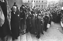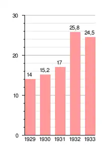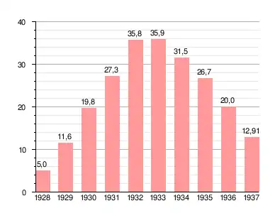 Con más de la mitad de la población dedicada a la agricultura, la distribución de la tierra siguió siendo extremadamente desigual.[36] En general el campesino húngaro era paupérrimo.[36] Se fomentó la industrialización del país para tratar de reducir la superpoblación rural, pero la industria nunca llegó a crecer lo suficiente como para absorber al exceso de población del agro.[37] La Gran Depresión golpeó con fuerza la economía húngara y en especial, la agricultura: los precios del cereal, exportación crucial para Hungría, se hundieron en el mercado mundial.[38] La grave crisis económica favoreció el aumento de la influencia de las potencias fascistas, Italia y Alemania, únicos compradores de la producción agrícola húngara que dejó de absorber el mercado internacional —y, en el caso de Alemania, receptor de parte de sus desempleados— y el poder de la derecha radical.[39] En 1938, Alemania controlaba ya algo más del 50 % de las importaciones y las exportaciones húngaras.[40] El aumento del comercio con Alemania y el comienzo del rearme sacaron al país de la depresión económica en la segunda mitad de la década de 1930.[33] Las condiciones de vida y trabajo de los obreros industriales siguieron siendo malas, pero el desarrollo de industrias relacionadas con el rearme eliminaron prácticamente el desempleo.[41] En cuanto a la población judía, en 1930 representaba el 5,1 % del total de la nación.[42] Casi la mitad residía en la capital, donde ocupaba un papel primordial en la industria, el comercio o las finanzas.[43] A finales de esta década y principios de la siguiente, se promulgaron una serie de importantes leyes discriminatorias que limitaron gravemente sus derechos y mermaron notablemente su situación económica.[44] Durante la Segunda Guerra Mundial, un total de 565 000 judíos fueron asesinados en los territorios controlados por Hungría.[45]