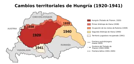 Gracias a la nueva cercanía a Alemania e Italia, el país recuperó parte de los territorios perdidos en Checoslovaquia en el Primer arbitraje de Viena en noviembre de 1938.[26] Para entonces Alemania había obtenido un papel fundamental en la política húngara.[27] El deseo popular de cambios, la actitud reaccionaria del Gobierno, opuesto a ellos, la impotencia de la izquierda y el poderío de los movimientos fascistas en Europa favorecieron el crecimiento de la ultraderecha radical como oposición favorable a las reformas.[28] En el Segundo arbitraje de Viena, organizado por Italia y Alemania en el otoño de 1940, Hungría recuperó el norte de Transilvania, cedido forzosamente por Rumania.[29] El país entró en guerra del lado del Eje, primero contra Yugoslavia y más tarde contra la URSS (a finales de junio) y los Aliados occidentales (en diciembre).[22] Los intentos de cambiar de bando realizados a final de la contienda fracasaron, tanto por el deseo de mantener los territorios recuperados y el anticuado sistema social como por la reticencia gubernamental a tratar con la Unión Soviética.[30] Para evitar un cambio de bando similar al italiano, los alemanes invadieron sin oposición el país en marzo de 1944.[31] El nuevo Consejo de Ministros, supervisado por un representante alemán, quedó encargado de reformar el Ejército y la economía nacionales en favor del esfuerzo bélico alemán y de poner fin al «problema judío».[32] Los alemanes dieron un golpe de Estado que acabó con la regencia del Horthy y entregó el poder a Ferenc Szálasi, caudillo del Partido de la Cruz Flechada.[33] Los soviéticos lograron expulsar a los alemanes finalmente del territorio húngaro, devastado por los combates, el 4 de abril de 1945.[34] Todas las anexiones húngaras fueron declaradas nulas en la posguerra.[35]
