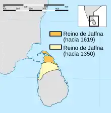 El Reino de Jaffna (en tamil ஆரியச்சக்கரவர்த்தி அரசு, 1215-1619), también conocido como Reino de Aryacakravarti, fue un Estado que ocupó parte de Sri Lanka y cuya capital fue la ciudad de Jaffna, en la península homónima situada en el norte de la isla. El reino se fundó después de la invasión de la región por Calinga Maga, que era oriundo de Kalinga, en la India.[1][2][3][4] Dominaba al comienzo el norte, noroeste y occidente de la isla y en 1258 se hizo feudo tributario del Imperio Pandya, situado en la actual India meridional. Obtuvo la independencia en 1323, gracias al debilitamiento del dominio de Pandya y después de la derrota y expulsión del último gobernador por Malik Kafur, general del ejército del Sultanato de Delhi.[1][5][6] Durante un breve periodo de tiempo en la primera mitad del siglo xiv, el reino se volvió la entidad política dominante en la isla, cuando todos los demás reinos de la región aceptaron sometérsele. Sin embargo, en 1450 Jaffna quedó dominado por el rival Reino de Kotte, a consecuencia de la invasión de un ejército tamil acaudillado por Chempaha Perumal, al servicio de Kotte.[5]