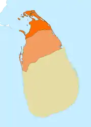 Al sur de la península de Jaffna, en el territorio que corresponde actualmente a las provincias del centro-norte y del este, se encontraba la región de los vannimai. Este territorio estaba escasamente poblado y lo gobernaban caciques tribales menores que se denominaban vanniar.[41] Los vannimai próximos a la frontera sur de la península y los del distrito de Trincomalee pagaban un tributo anual al Reino de Jaffna, en vez de impuestos.[7][41] El tributo se pagaba generalmente en dinero, cereales, miel, elefantes o marfil. Este sistema de pago anual único se estableció debido a la lejanía de estos territorios de la capital.[41] Durante los primeros años y hasta alrededor de mediados del siglo xiv, los reinos cingaleses de las regiones occidentales, meridionales y centrales de la isla también fueron feudos del Reino de Jaffna, hasta el momento en que el propio reino fue ocupado por el ejército de Parakrama Bahu VI en 1450, situación en la que estuvo cerca de diecisiete años.[42] Hacia principios del siglo xvii, Jaffna también administraba un enclave en el sur de la India llamado Madalacotta.[43]