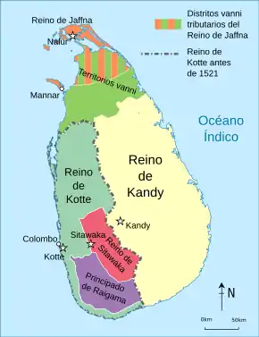 La llegada de las fuerzas coloniales portuguesas a la isla de Sri Lanka en 1505 originó diversos problemas políticos; especialmente grave fue su conquista del estratégico estrecho de Palk, que permitía la comunicación de todos los reinos de la isla con la India meridional. Al principio, muchos de los reinos de la región se enfrentaron a los colonos portugueses, aunque con el tiempo la región acabó pacificada. En 1617, Cankili II, un usurpador, acometió a las fuerzas portuguesas; su derrota precipitó el fin de la independencia del reino en 1619, consecuencia de la conquista portuguesa.[13][14] Aunque posteriormente algunos rebeldes como Migapulle Arachchi intentaron recuperar la posesión del reino, las rebeliones fueron sucesivamente aplastadas.[15]