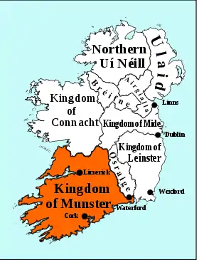 Munster tuvo que contener los asalto Vikingos de los Uí Ímair a partir del siglo IX, que se establecieron en Limerick, Waterford and Cork. En esa misma época, los Dál gCais (ancestros de los Ó Briain),[2] previamente conocidos como los Déisi, comenzaban a emerger en Munster. Ayudados en parte por los Uí Néill, los antiguamente pequeños Dál gCais came llegaron a desafiar el control de los Eóganachta en Munster. Las hazañas de su más famoso miembro,Brian Bóruma, conocido por la Batalla de Clontarf dieron el poder a los Dál gCais durante el resto del siglo XI. Después de crisis interna, Munster fue dividido por el Rey Supremo Toirdelbach Ó Conchobhair en el Tratado de Glanmire in 1118, entre Thomond gobernado por los Ó Briain y Desmond gobernado por los Mac Cárthaigh.