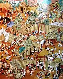 En 1767, después de dominar el sudeste asiático durante casi 400 años, el Reino de Ayutthaya fue destruido. El palacio real y la ciudad fueron quemados hasta los cimientos. El territorio fue ocupado por el ejército birmano y los líderes locales se declararon señores, incluyendo a los señores de Sakwangburi, Pimai, Chanthaburi y Nakhon Si Thammarat. Chao Tak, un noble de ascendencia china y un líder militar capaz, procedió a convertirse en un señor por derecho de conquista, comenzando con el legendario saco de Chanthaburi. Basado en Chanthaburi, Chao Tak reunió tropas y recursos, y envió una flota al Chao Phraya para tomar el fuerte de Thonburi. En el mismo año, Chao Tak pudo retomar Ayutthaya de los birmanos sólo siete meses después de la caída de la ciudad. [1]