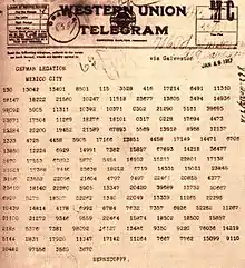 Durante la Primera Guerra Mundial (1914-1918) México se mantuvo neutral. Durante este tiempo, México estaba preocupado con su Revolución mexicana (1910-1920) que tuvo lugar al mismo tiempo que la Primera Guerra Mundial. En enero de 1917, agentes británicos interceptaron un telegrama enviado al embajador alemán en México Heinrich von Eckardt por Arthur Zimmermann, secretario de Estado de Asuntos Exteriores del Imperio alemán. En el telegrama, Alemania propuso a México que si los Estados Unidos entrará a la guerra, México debería unirse y ponerse del lado de los Potencias Centrales. En agradecimiento, y si las Potencias Centrales ganaran, México recuperaría el territorio de Arizona, Nuevo México y Texas que México perdió en su guerra con los Estados Unidos durante la Guerra mexicano-estadounidense en 1848. El telegrama, conocido como el Telegrama Zimmermann fue interceptado cuando el telegrama estaba siendo enviado a la embajada alemana en Washington, D.C. para ser reenviado a la Ciudad de México. México finalmente rechazó el telegrama y continuó siendo neutral durante la guerra.[5]