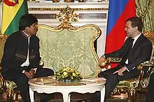 En marzo de 2009, Rusia y Bolivia firmaron un protocolo de acuerdo para fortalecer la democracia en cada nación. En febrero de 2009 el presidente Evo Morales visitó Moscú. Su viaje fue el primero de un jefe de Estado boliviano en la capital rusa. Durante la visita, ambos líderes firmaron un acuerdo para fortalecer los vínculos energéticos y militares entre las dos naciones, además de fortalecer la cooperación contra narcóticos.[3] En mayo de 2009, el Viceministro de Relaciones Exteriores de Bolivia dijo que Bolivia estaría realizando una compra multimillonaria de armas y transporte de Rusia para combatir el contrabando y la producción de drogas en Bolivia. [2]