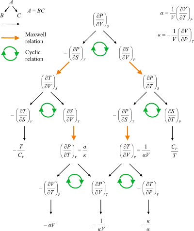 donde los potenciales como funciones de sus variables naturales térmicas y mecánicas son la energía interna U(S, V), entalpía H(S, P), energía de Helmholtz F(T, V) y energía de Gibbs G(T, P). Como auxiliar, podemos recurrir al cuadro termodinámico o rueda termodinámica, que es el diagrama de Max Born, que se utiliza para ayudar a determinar las relaciones termodinámicas. La utilidad de estas relaciones se encuentra en cuantificar los cambios de entropía, que no son medibles directamente, en términos de cantidades medibles como la temperatura, el volumen y la presión.