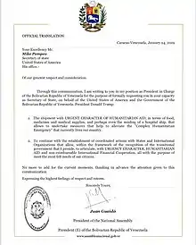 El 24 de enero de 2019, Juan Guaidó envió una carta al secretario de Estado de los Estados Unidos, Mike Pompeo donde solicitó ayuda humanitaria inmediata a Estados Unidos.[46]