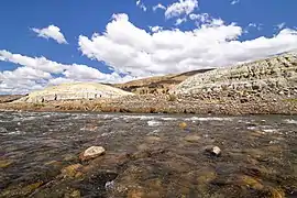 - Parte del montículo norte del relave al lado del río Santa, vista hacia el noroeste.