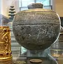 El relicario es un pequeño contenedor que recuerda al pyxis del mundo clásico. Fue encontrado sin su tapa, y está decorado con la representación de un loto en el fondo del objeto.[4] El relicario se realizó en oro repujado y es muy pequeño, con una altura de 7 cm y un diámetro de 6,7 cm Se considera como una obra maestra del arte greco-budista de Gandhara.
