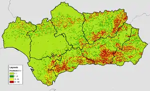 Aproximadamente el 40% del territorio andaluz es de una fisionomía llana. En esta zona hay que incluir la práctica totalidad de la Depresión Bética, Surco Intrabético y Valle de los Pedroches, además de otras zonas de menor importancia en superficie. El segundo tramo, supone una transición entre las zonas llanas y el comienzo de las zonas montañosas. Está muy repartido por todas las provincias, sin grandes superficies continuas. Las zonas abruptas, correspondientes al tercer tramo, se concentran en las zonas montañosas, configurando las cumbres de Sierra Morena y el Aljibe y por otra parte suponen las primeras estribaciones de los grandes cordilleras de los Sistemas Béticos. Por último, la zona montañosa se concentra en las zonas más altas de Sierra Nevada, Cazorla y Segura, Sierras Sur de Jaén, Montes de Málaga; aunque también aparece más dispersa por otras formaciones como el Subbético cordobés o la Sierra de Tejeda-Almijara. En Sierra Morena son muy raras de encontrar.