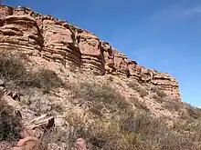 La meseta patagónica es un conjunto de altiplanos y llanuras elevadas y áridas intrincada con escarpadas sierras, enclavada entre los Andes patagónicos y el océano Atlántico, donde cae abruptamente en altos acantilados que dan al Mar Argentino. Esta altiplanicie está salpicada por esporádicas sierras bajas y pequeñas y cerros aislados (cerro Anecón Grande, 2010 m s. n. m. en Río Negro, cerro Calfuquir, de 1885 m s. n. m. en Chubut, cerro Cojudo Blanco, 1335 m s. n. m. en Santa Cruz). En la Patagonia argentina también se encuentra la depresión más profunda de toda América: la laguna del Carbón a 105 metros bajo el nivel del mar.[36]