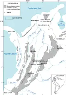 La Cordillera de los Andes cubre una parte considerable de Colombia. En este país los Andes se ramifican en tres vertientes:[4]
