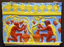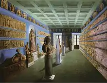 - Losas de revestimiento: En el borde superior, donde la losa forma un borde liso, había una decoración con un patrón de ova y dardos y el borde inferior está decorado con lotos, palmetas y antemas, siguiendo el contorno del patrón decorativo. Había tres o cuatro agujeros en cada relieve, a través de los cuales se sujetaban los azulejos a la pared.[17]