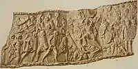 El ejército romano es asediado por las tropas dacias de Decébalo en una fortaleza sobre el limes moesicus[10] (quizás Oescus o Ratiaria?). Los uniformes de los soldatos romanos parecen ser del tipo auxiliar más que legionario. Esto podría significar sencillamente que una sección entera de <i id="mwAdY">limes</i> danubiano estuvo bajo asedio por las tropas dacias. A los pies de la fortaleza, a la derecha, parece reconocerse un desertor romano, recordado también en las fuentes literarias. | ![]() |