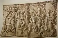 Tropas romanas en marcha. Sobre el fondo, aparecen numerosas cabezas de dacios escondidos en las montañas. A la derecha se representa una escena (en parte dañada) de deportación en masa de la población de la antigua Dacia (hombres, mujeres y niños). | ![]() |