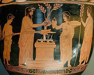 En las formas cultuales adoptadas por la religión de la antigua Grecia, los principales ritos son las oraciones, las ofrendas, los sacrificios, las fiestas públicas y los juegos.[1]Estos ritos consisten en no excluirse; al contrario: una ofrenda se acompaña de una oración, incluso de un sacrificio, que puede coronar una fiesta pública, pero la religión griega careció tanto de una clase sacerdotal como de libros sagrados.