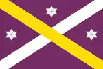 Escudo losanjado: de púrpura, 2 llaves pasadas en sautor con los dientes arriba y mirando hacia fuera, la de oro una banda y por encima de la de argén en barra, acompañadas de 3 estrellas de argén malordenadas. Por timbre una corona mural de pueblo.[4]