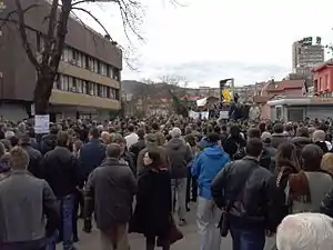 Los disturbios en Bosnia y Herzegovina del 2014 son una serie de levantamientos y protestas que comenzaron en el pueblo de Tuzla el 4 de febrero de 2014, pero que se propagaron rápidamente en múltiples ciudades de Bosnia y Herzegovina, incluyendo a Sarajevo, Zenica, Mostar, Jajce, Brčko, Bihać, Doboj, Prijedor,[34] Travnik, Bugojno, Donji Vakuf, Kakanj, Visoko, Breza, Gračanica, Sanski Most, Cazin, Živinice, Goražde, Orašje, Srebrenik, Bijeljina,[35] Prozor and Tešanj,[36] entre otros, por razones sociales y con el objetivo de derrocar al gobierno.[37][38] Las protestas han sido las situaciones más violentas que el país ha vivido desde el fin de la guerra de Bosnia.[39][40] Éstas protestas han ocurrido, en gran parte, en la entidad de la Federación de Bosnia y Herzegovina, aunque el mismo nivel de malestar o activismo no se ha visto en la República Srpska.[41]