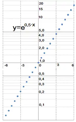 Cualquier conjunto de datos que pueda ajustarse a la expresión podrá representarse en forma de línea recta, , donde representa el logaritmo en base o natural, ya que ambas expresiones son equivalentes.[2] Si usamos logaritmos en bases , distintas a la natural, la relación exponencial linealizada será .