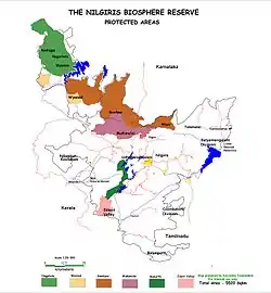 Este ecosistema fascinante de las montañas Nilgiris y de sus ambientes circundantes que cubren una extensión de más de 5000 kilómetros cuadrados fue constituido como reserva de la biosfera de Nilgiris por la UNESCO en septiembre de 1986 bajo el programa del hombre y de la biosfera. La reserva de la biosfera de Nilgiris es la primera y principal reserva de la biosfera de la India, con un patrimonio rico en flora y fauna. Los grupos tribales como las Todas, Kotas, Irullas, Kurumbas, Paniyas, Adiyans, Edanadan Chettis, Cholanaickens, Allar, Malayan, etc., son nativos de la reserva.[1]