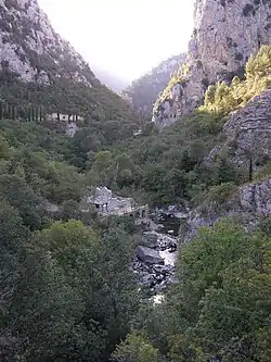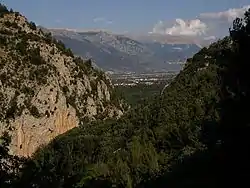 La salida del río Aterno de la garganta, opuesta al espectacular y sugerente eremo di San Venanzio, marca el paisaje de la fértil y verdeante llanura aluvional, caracterizada por los terrenos cultivados y de las zonas boscosas de naturaleza riparia.