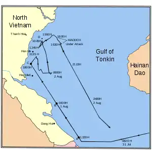 Mapa que muestra las operaciones del incidente del golfo de Tonkín, desde el punto de vista de la Marina de Estados Unidos.