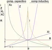 Alcanzada la frecuencia de resonancia "fr" la intensidad I del circuito adquiere su máximo valor, al mismo tiempo que la impedancia Z tiene su mínimo valor; es decir: Z = R (Nótese como en la figura anterior la curva violeta de Z coincide en su punto más bajo con la recta roja de R). Para frecuencias menores y mayores a la fr, el circuito tiene comportamiento capacitivo e inductivo respectivamente.
