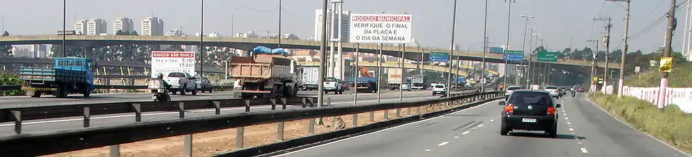 Señales informando el inicio de la Zona de Restricción Vehicular, en la entrada a la Marginal do Rio Pinheiros (a la derecha) y la Marginal do Rio Tietê (a la izquierda), São Paulo, Brasil.