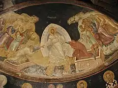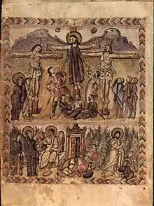 Sin embargo, el momento de la Resurrección no se describe como tal en los Evangelios, por lo que durante más de mil años no se representó directamente en el arte. En su lugar, al principio se representaba mediante representaciones simbólicas, como el Chi Rho, las dos primeras letras griegas de Cristo, rodeadas por una corona que simboliza la victoria de la resurrección sobre la muerte.[2] Posteriormente se utilizaron varias escenas que se describen en los Evangelios, y también el Desgarro del infierno, que no lo es. En el arte bizantino y posteriormente en el arte ortodoxo oriental esto ha seguido siendo así, pero en Occidente la representación del momento real de la Resurrección se hizo común durante el periodo gótico.