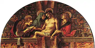 La Piedad de la Pinacoteca Vaticana se acerca al retablo por razones de medidas y estilo, no existiendo documentación de que las obras fueran originariamente un conjunto (como rechazó Zeri). Sería inusual que la Piedad presente de nuevo la firma OPVS CAROLI CRIVELLI VENETI. Se sabe que la obra fue llevada a la pinacoteca de Gregorio XVI en 1831 en los Museos Capitolinos.