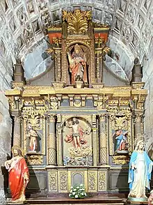 El retablo, policromado por Pedro Carballal,[1] se compone de un cuerpo con tres calles, banco y ático. La hornacina central, con arco rebajado e intradós artesonado, está enmarcada por pilastras coronadas por pequeñas ménsulas de rocalla y flanqueada por columnas corintias las cuales presentan relieve en escamas en el tercio inferior y en la zona central (donde son más pronunciadas) y fuste estriado en diagonal en el tercio superior. A ambos lados, en las calles laterales, se hallan superficies planas decoradas con arcos rebajados en relieve y rocalla en la zona superior, estando los extremos del cuerpo del retablo cerrados con columnas idénticas a las que enmarcan la calle central. La cornisa que divide el cuerpo del ático es escalonada y se apoya en peanas trapezoidales las cuales descansan sobre ménsulas que a su vez enmarcan el rostro de un ángel en bajorrelieve en el entablamento de la calle central. El ático alberga una hornacina con arco rebajado coronada por un enorme motivo ornamental de rocalla. El nicho está flanqueado por pilastras ricamente ornamentadas junto a las que se ubican dos aletones rematados en los extremos por pequeñas columnillas de base cuadrada con dos cuerpos y coronadas por pináculos. Bajo el retablo, sin formar parte del mismo, se halla un altar pétreo con superficie de madera decorado en los extremos del frontal con ménsulas.